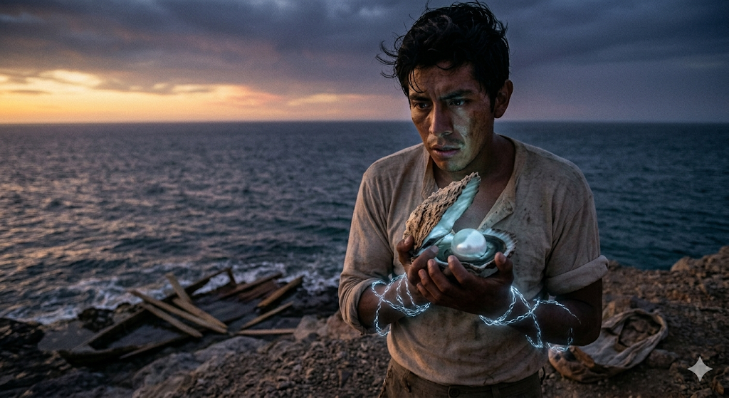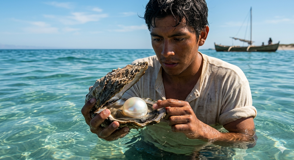 스타인벡이 『진주』를 쓰기 전, 그는 멕시코 라 파스에서 들은 이야기를 Sea of Cortez에 기록했습니다. 인디언 소년이 거대한 진주를 발견했을 때 — 그 진주가 의미한 것은 단순한 부가 아니었어요. 바로 노동으로부터의 영원한 해방이었습니다.